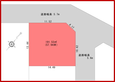接道状況 | 北西: 幅員5.7m 北東 幅員5.6m |